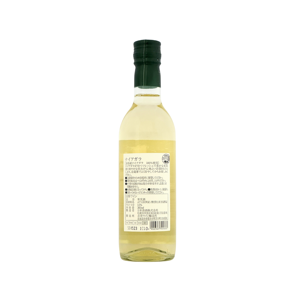 余市産ナイアガラ種ぶどう100%使用。生食用品種でおなじみのナイアガラは独特の芳香と果実そのものを口に含んだような鮮烈な爽快感を味わえるワインです。